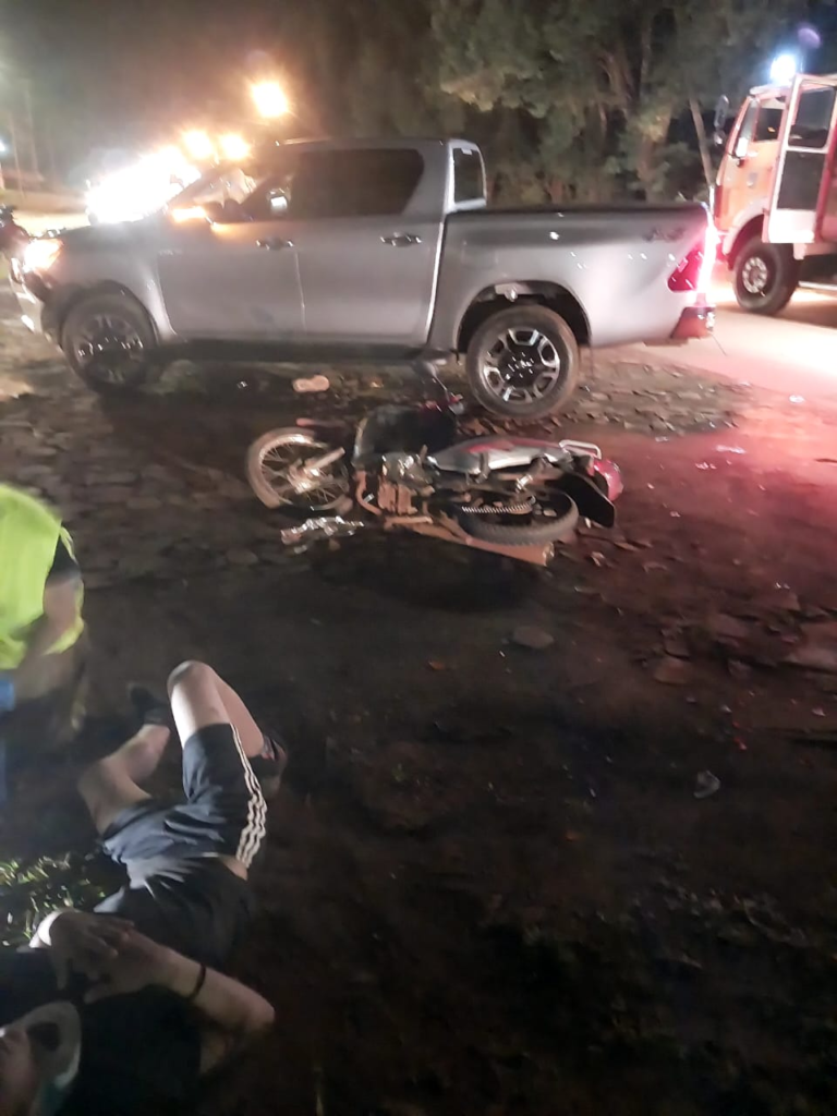 Rápidamente se dirige una dotación hasta el lugar, se trató de una motocicleta marca Motomel Blitz 110 cc conducida por un menor de edad y acompañado por otro menor (ambos sexos masculinos) que por razones que se desconocen y que está bajo investigación colisionan con una camioneta Toyota Hilux, conducida por una persona mayor de edad, masculino.