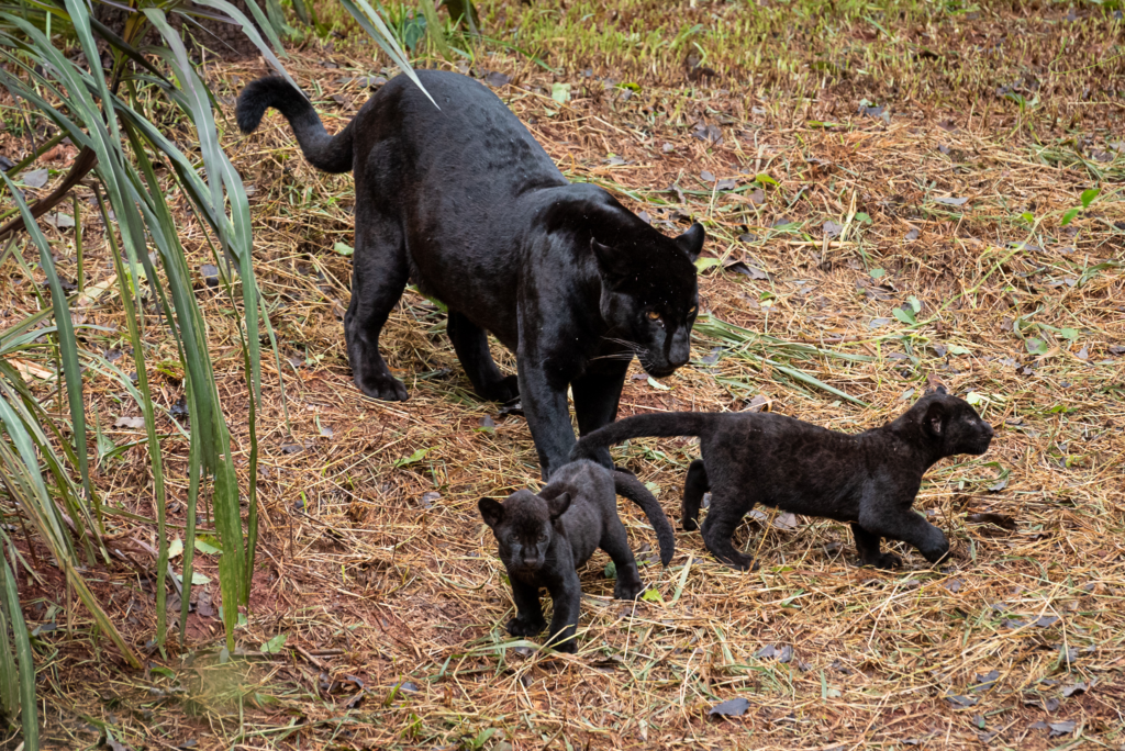 Los dos leopardos son gemelos melánicos (negros) y se parecen mucho a su madre, Nena. Nacieron el 29 de noviembre del año pasado, coincidiendo con el Día Internacional del Jaguar, y crecen sanos, con un peso aproximado de 9 kg. De adultos, pueden llegar a pesar alrededor de 70 kg.