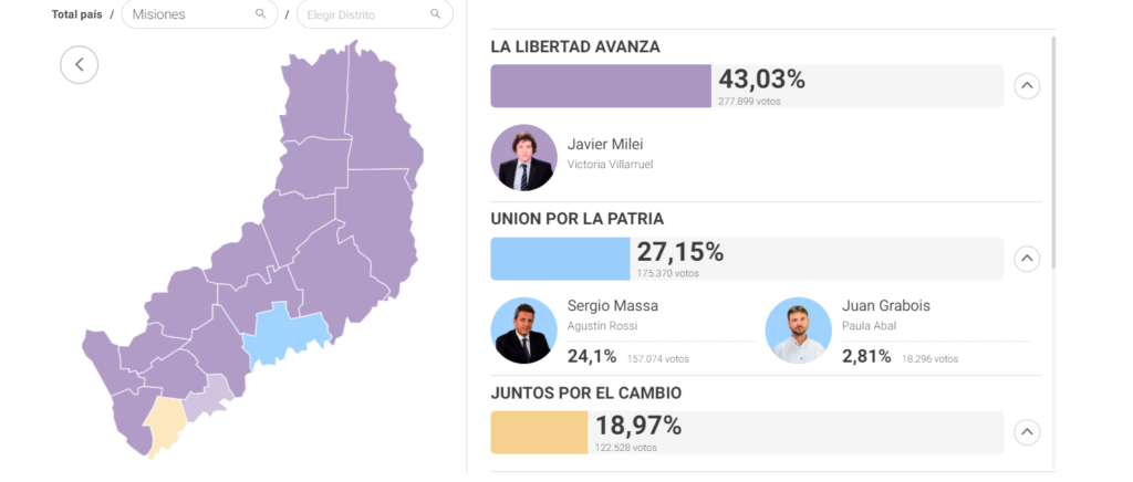La mayoría de los electores que votaron a Milei en las elecciones pasadas eligieron a la Renovación, donde también hubo una fuga masiva de votos para aquellos misioneros que quieren un cambio. Aquí es donde se ve por qué la Libertad Avanza no pudo formalizarse legalmente como partido (algo que los libertarios denunciaron) y tuvo que ir con boleta corta, además del desdoblamiento de las elecciones. En Misiones, el 43,03% eligió a la Libertad Avanza, mientras que el 27,15% votó a Massa, muy lejos del 65% que obtuvo la Renovación en la provincia.