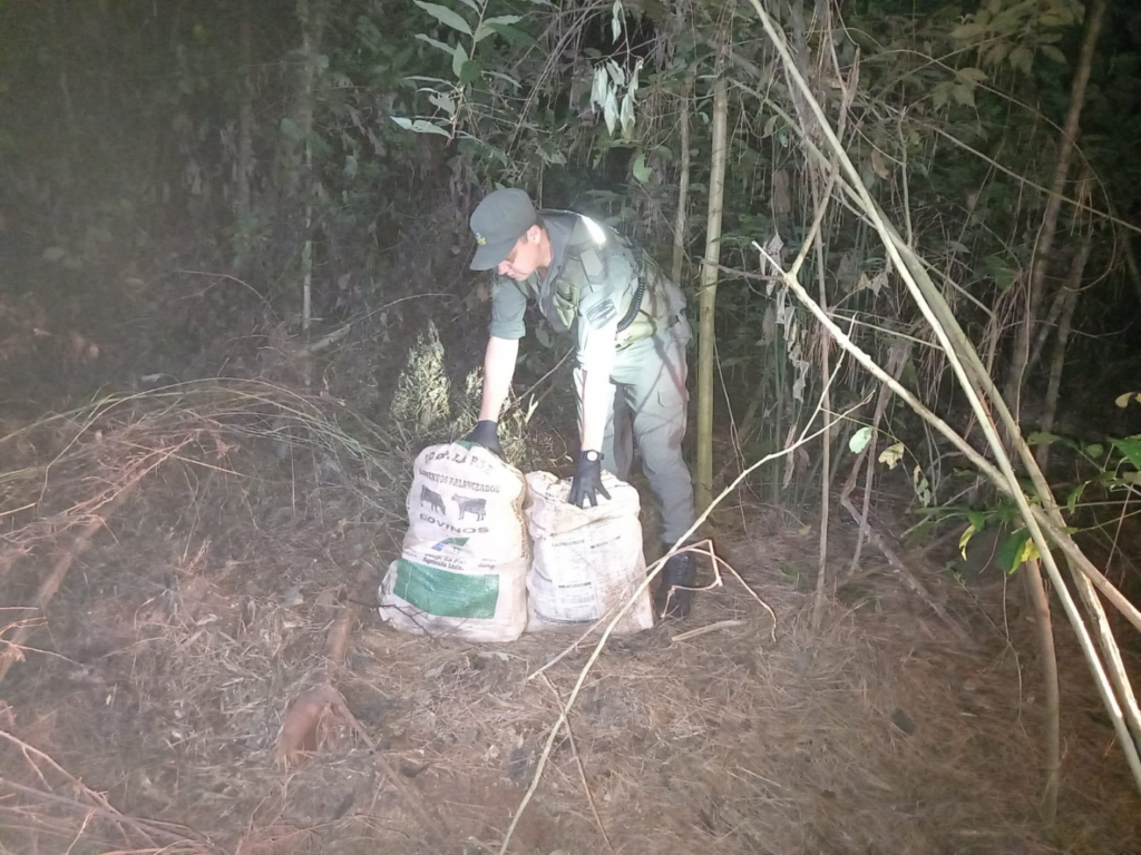 Esta madrugada, integrantes del Grupo “El Alcázar” con apoyo de la Sección “Puerto Rico” dependientes del Escuadrón 11 “San Ignacio” realizaban patrullajes a pie y motorizados sobre caminos terrados y sendas provenientes de la costa del rio Paraná, en cercanías a la zona denominada «Mil Hectáreas», en Colonia Luján (Misiones), cuando observaron en un trillo dos bolsas tipo arpillera cubiertos con pastizal, de los que emanaban un fuerte olor característico a la marihuana.