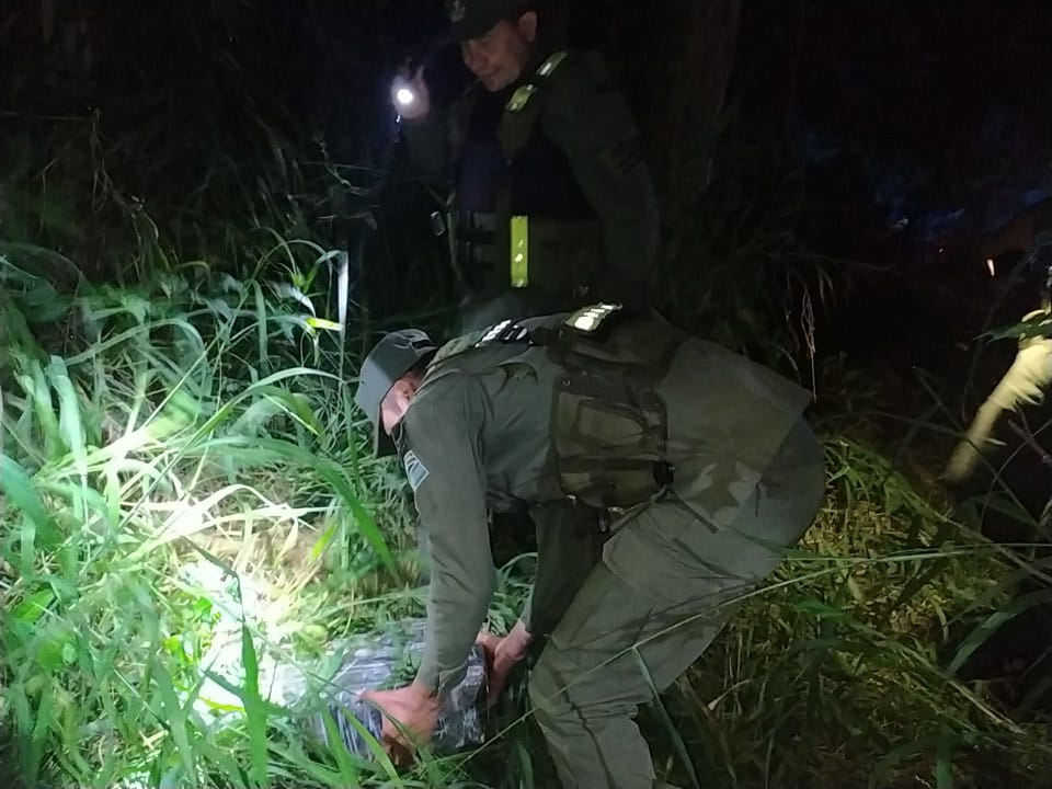 Al llevar a cabo un rastrillaje por la zona, los uniformados detectaron 104 bultos envueltos en nylon negro, los cuales se encontraban debajo de una lona, sobre una base improvisada de madera.