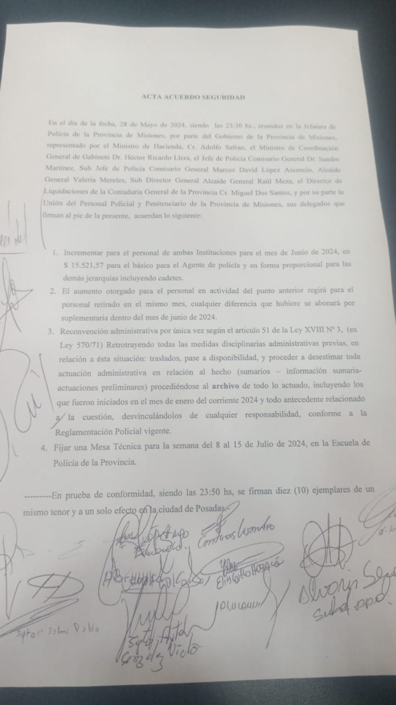 En el dia de la fecha, 28 de Mayo de 2024, siendo las 23:30 hs., reunidos en la Jefatura de Policía de la Provincia de Misiones, por parte del Gobierno de la Provincia de Misiones, representado por el Ministro de Hacienda, Cr. Adolfo Safran, el Ministro de Coordinación General de Gabinete Dr. Héctor Ricardo Llera, el Jefe de Policia Comisario General Dr. Sandro Martinez. Sub Jefe de Policia Comisario General Marcos David López Ascencio, Alcaide General Valeria Mereles, Sub Director General Alcaide General Raül Meza, el Director de Liquidaciones de la Contaduría General de la Provincia Cr. Miguel Dos Santos, y por su parte la Unión del Personal Policial y Penitenciario de la Provincia de Misiones, sus delegados que firman al pie de la presente, acuerdan lo siguiente: