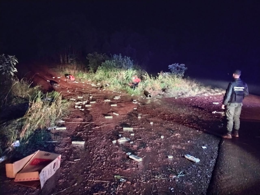 En horas de la madrugada, una camioneta que se aproximaba al control escapa a gran velocidad. Ante tal situación, y bajo la sospecha de un ilícito, se inició la búsqueda del rodado evadido. A los pocos kilómetros, los gendarmes pudieron ver marcas de neumáticos sobre el asfalto, indicando maniobras buscas, así como varias cajas de cigarrillos dispersas en los alrededores.