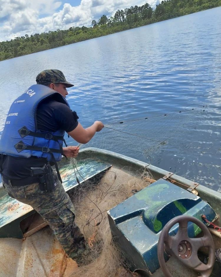 Por otro lado, en Puerto Libertad a la vera del lago Urugua-í los efectivos policiales junto a integrantes del Ministerio de Ecología, incautaron dos bolsas de nylon con cuatro redes que habían sido recientemente utilizadas y abandonadas por pescadores.