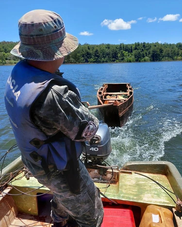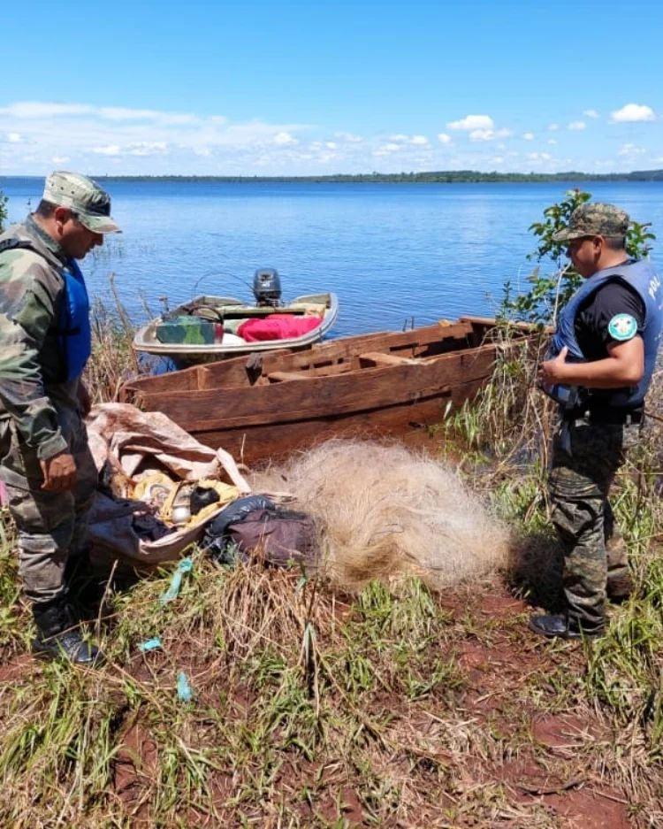 Así también, los agentes realizaban recorridas en la costa del lago Urugua-í, donde avistaron cuatro boyas caseras, las mismas tenían seis redes de pesca recientemente colocadas. Seguidamente, continuaron con las recorridas para dar con los pescadores, hallando cinco botes y allí, descubrieron un campamento con elementos de caza, los cuales fueron desmantelados.