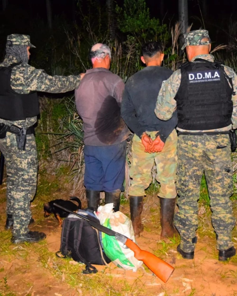 Primeramente, en la ciudad de Posadas arrestaron a dos presuntos cazadores furtivos de 70 y otro de 26 años, al momento que se dirigían hacia una zona de montes, llevando una escopeta, un cuchillo, tres bolsas arpilleras, una cuerda, una pala, un aislante térmico y bolsas para dormir, elementos que fueron secuestrados.