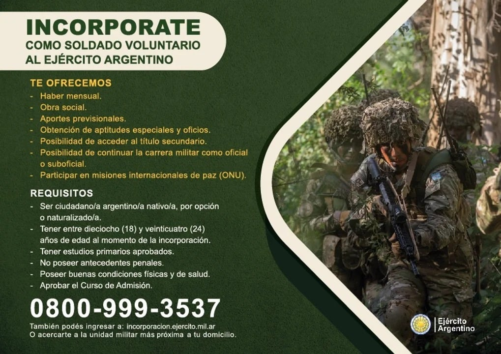 Se encuentra abierta la convocatoria al Ejército y la Fuerza Aérea Argentina en diferentes bases estratégicas. La iniciativa está dirigida a jóvenes de 18 a 24 años. Enterate los requisitos que se deben cumplir para formar parte y los beneficios que brinda la institución.