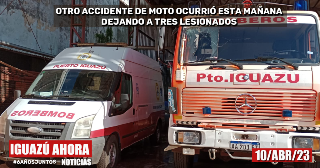 #BomberosIguazú El día de hoy, lunes 10 de abril, en horas de la mañana, aproximadamente a las 7:40 horas la guardia de Bomberos Voluntarios de Iguazu recibe una denuncia de accidente de motocicleta (dos motos) con 3 heridos, sobre la Avenida Los Trabajadores (Frente a la plazoleta La Nona) Se activa el sistema Alertor (sistema […]