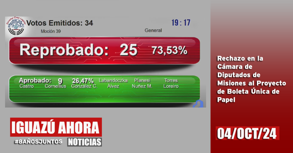 En la sesión de ayer, la Cámara de Diputados de Misiones rechazó el proyecto de ley que proponía implementar la Boleta Única de Papel en los procesos electorales de la provincia. La iniciativa fue presentada por la diputada Analía Bibiana Labandoczka del PRO, con el acompañamiento de los diputados Selva Mikaela Daniela González Coria, Horacio […]