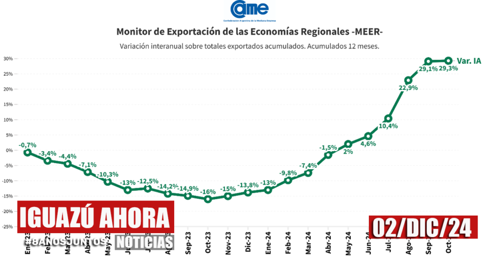 De acuerdo con el Monitor de Exportaciones de las Economías Regionales (MEER) elaborado por la Confederación Argentina de la Mediana Empresa (CAME), el mes de octubre terminó con un incremento en las exportaciones de las economías regionales del 29,3% en dólares y 23,4% en toneladas, lo que representa una suba interanual de USD 1.990,3 millones en […]