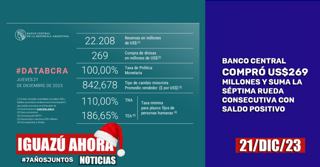 #Atentos El Banco Central (BCRA) adquirió hoy US$269 millones en el Mercado Único y Libre de Cambios (MULC), con lo que suma siete ruedas consecutivas de compras por un monto total de casi US$1.191 millones. En el segmento bursátil, los dólares financieros registraron resultados mixtos: el Contado con Liquidación (CCL) subió $8,72, en $955,39, mienteas […]