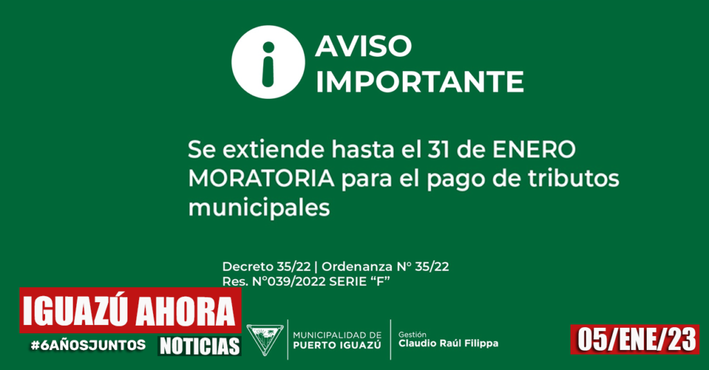 #Atentos Desde la Dirección de Rentas informan que mediante la resolución 06/23, se ha extendido la moratoria implementada a través del Art. 1ro de la ordenanza 35/22 para el pago de tributos municipales hasta el 28 de Abril. Los tributos incluidos en el presente régimen son: 1) Tasa general de inmueble (TGI) 2) Tasa de […]