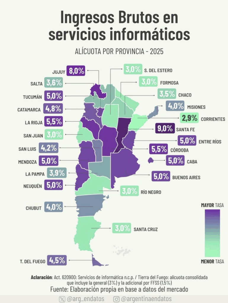 Por el contrario, destacó que Misiones tiene alícuotas de Ingresos Brutos más bajas que provincias como Córdoba, Buenos Aires o Jujuy (ver gráfico adjunto). En el caso de los servicios informáticos, por ejemplo, Misiones aplica una alícuota del 4,0 %, mientras que Santa Fe aplica un 9,0 %, Jujuy un 8,0 %, y Córdoba un 5,5 %.