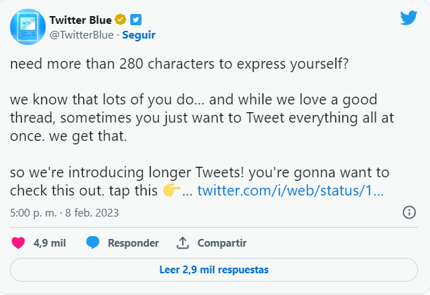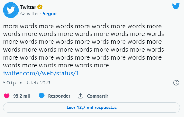 «Hacenos saber lo que pensás. ¡Estamos emocionados de ver cómo usas el espacio extra! Si tenés más para decir, podés suscribirte a Twitter Blue haciendo clic en el enlace de nuestra bio», finalizó la red social, intentando vender su servicio premium.